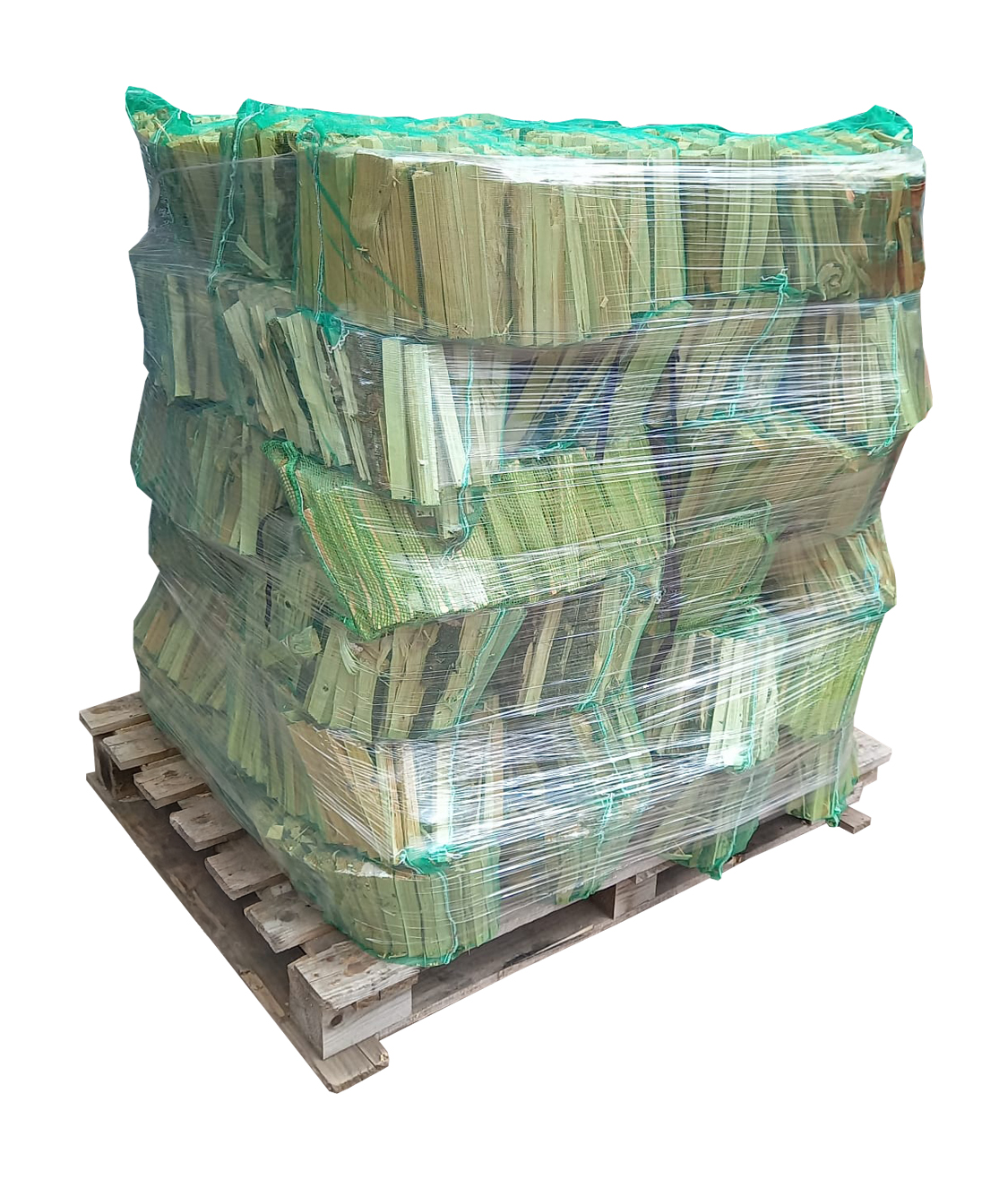 Our pallets contain 48 large nets of kiln-dried kindling, made from locally sourced hardwood and carefully kiln-dried to just 15% moisture for easy lighting and efficient burning. Each net measures approximately 50cm x 20cm, with uniform, branch-free logs, ready to use straight from the net.